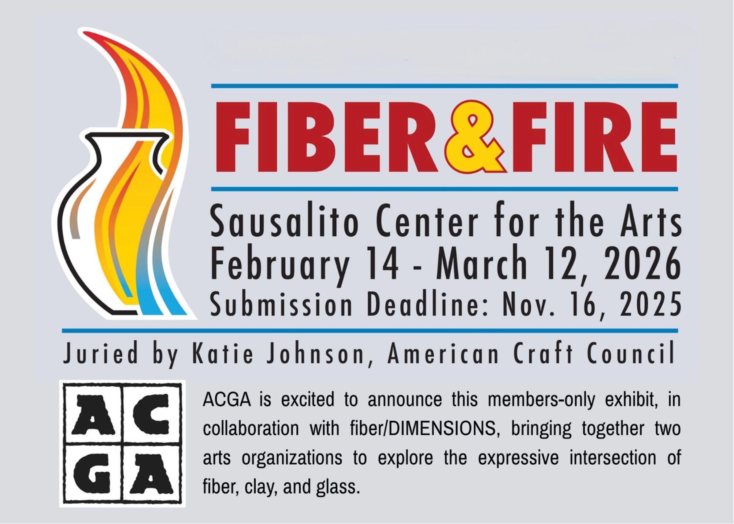 Lee’s work is selected for the “Fiber & Fire Exhibition” at the Sausalito Center for the Arts (SCA). Two arts organizations—Association of Clay & Glass Artists of California (ACGA) and fiber/DIMENSIONS—come together to explore the dynamic relationship between fiber, clay, and glass: three distinct yet kindred materials in contemporary craft.